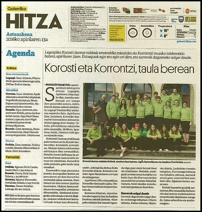 Larunbat honetan, 18:30etan, LEGAZPIn egongo gara KORRONTZI DANTZAN ikuskizunarekin. Kontzertuari buruz artikulua egunkarian…