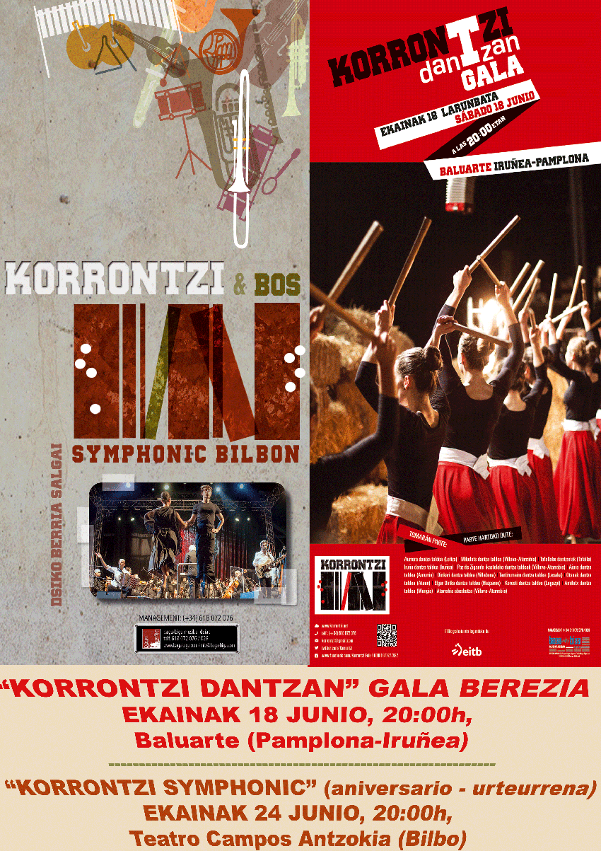 Ekaina honetan, Korrontziren 2 KONTZERTU BEREZI bi formatu handitan: 18an Iruñeko Baluarten "KORRONTZI DANTZAN GALA", 300 dantzari oholtza gainean izango direlarik! Eta 24ean Bilboko Campos Antzokian "KORRONTZI SYMPHONIC BILBON", X. urteurrenagatik eskainitako kontzertua gogoratuz, Bilboko Orkestra Sinfonikoarekin (BOS)! EZIN DITUZUE GALDU!