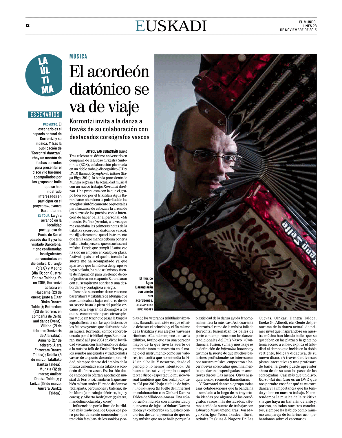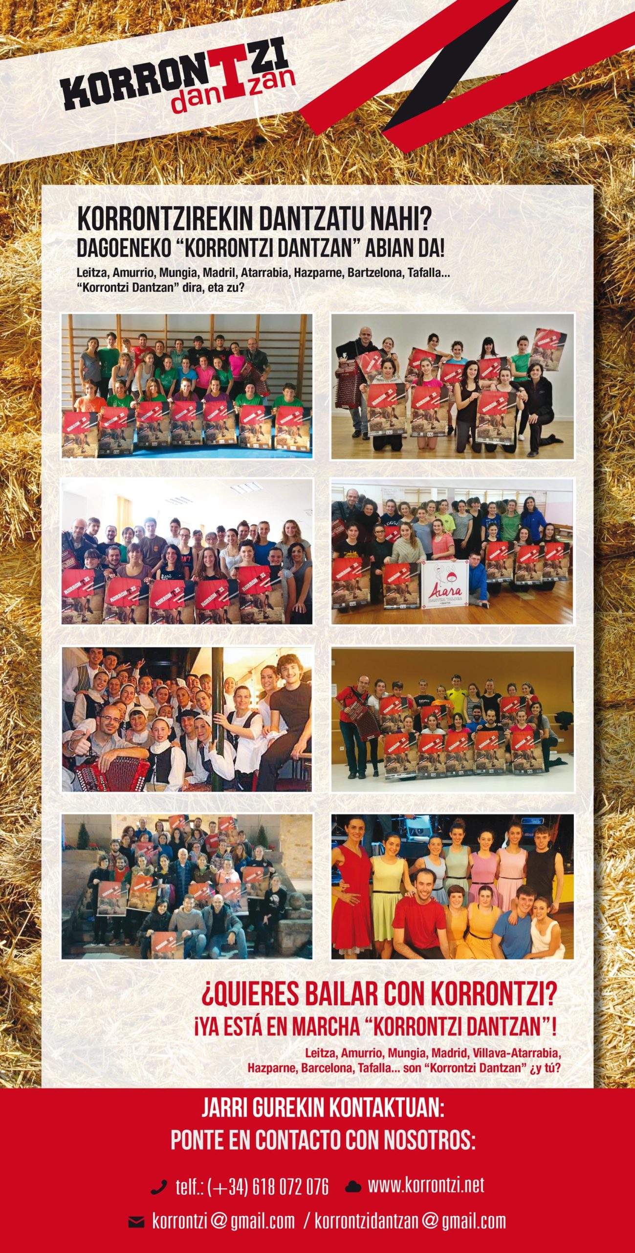 Le nouveau CD-DVD "Korrontzi Dantzan» a été présenté aujourd'hui lors d'une conférence de presse. En lui, vous pouvez trouver les chorégraphies qui au cours des dernières années, divers chorégraphes basques ont créé musique Korrontzi. Ce travail a impliqué danseurs et groupes de danse différents, ainsi que plusieurs musiciens invités, mais aussi dans le "savoir" section éducative, vous pouvez en apprendre plus de la chorégraphie. D'autre part, le «Korrontzi Dantzan" dans la variante pratique, le projet sera tournée qui va visiter des endroits différents à la fois dans le Pays Basque, telles que Madrid, Barcelone et la Hollande. Et bien qu'il existe de nombreux concerts fermés, est tournée est toujours ouvert à toutes les parties prenantes. Pendant le concert et le travail avant la répétition, vous pouvez profiter de la musique Korrontzi avec ses danseurs et de collaboration de groupe de danse ou des danseurs locaux. Ceci est juste le début, donc … à DANSER!!!