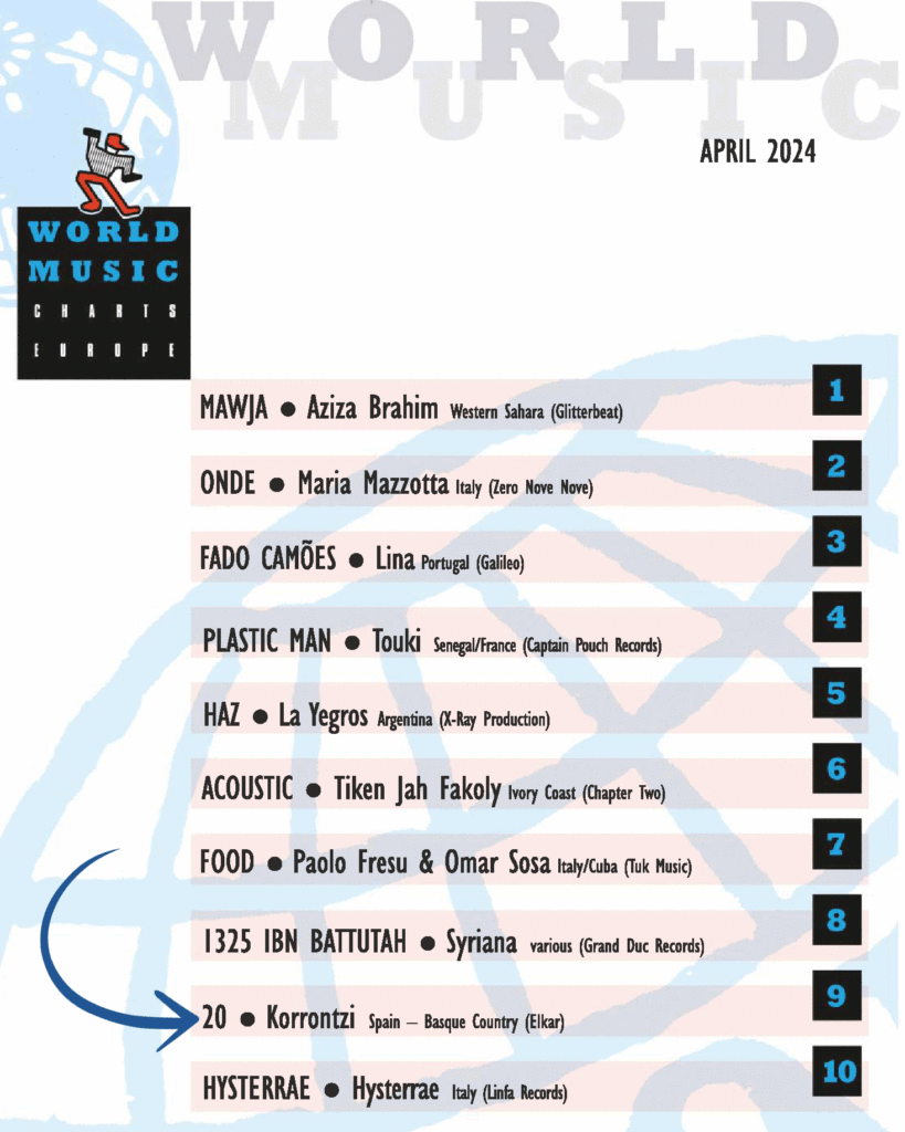 El trabajo llamado «20» publicado por el grupo Korrontzi para celebrar su vigésimo aniversario, ha sido seleccionado en la lista «World Music Charts Europe» como ¡Unos de los 10 mejores discos a nivel internacional!